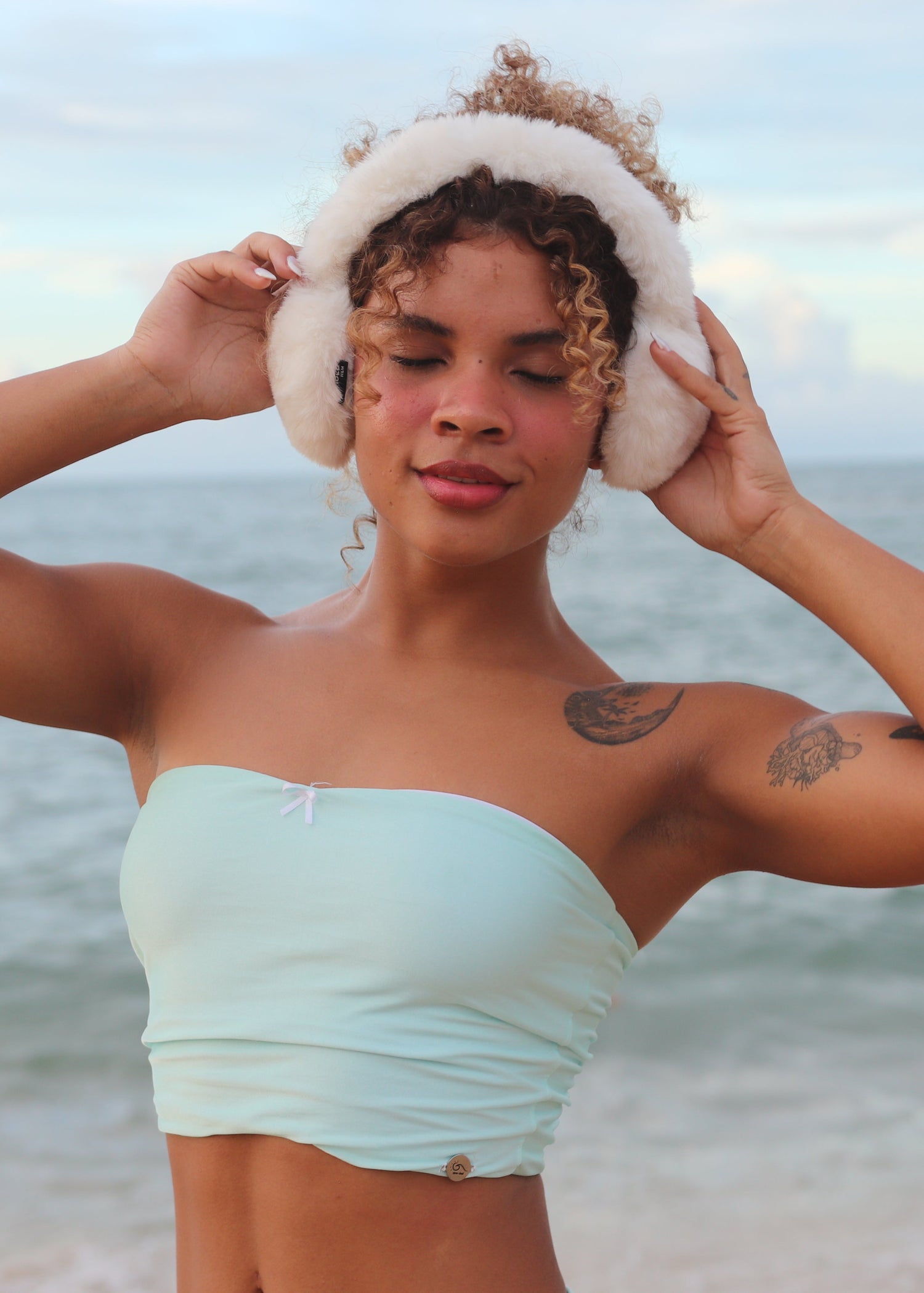Introducing a full coverage bikini top. This bikini top features a dainty bow detail on the bust and straight texture that stretch to your body to provide a custom fit matching it with our Ballet Mint bottom or avoid tanlines when you pair it with the Mint Bottom.